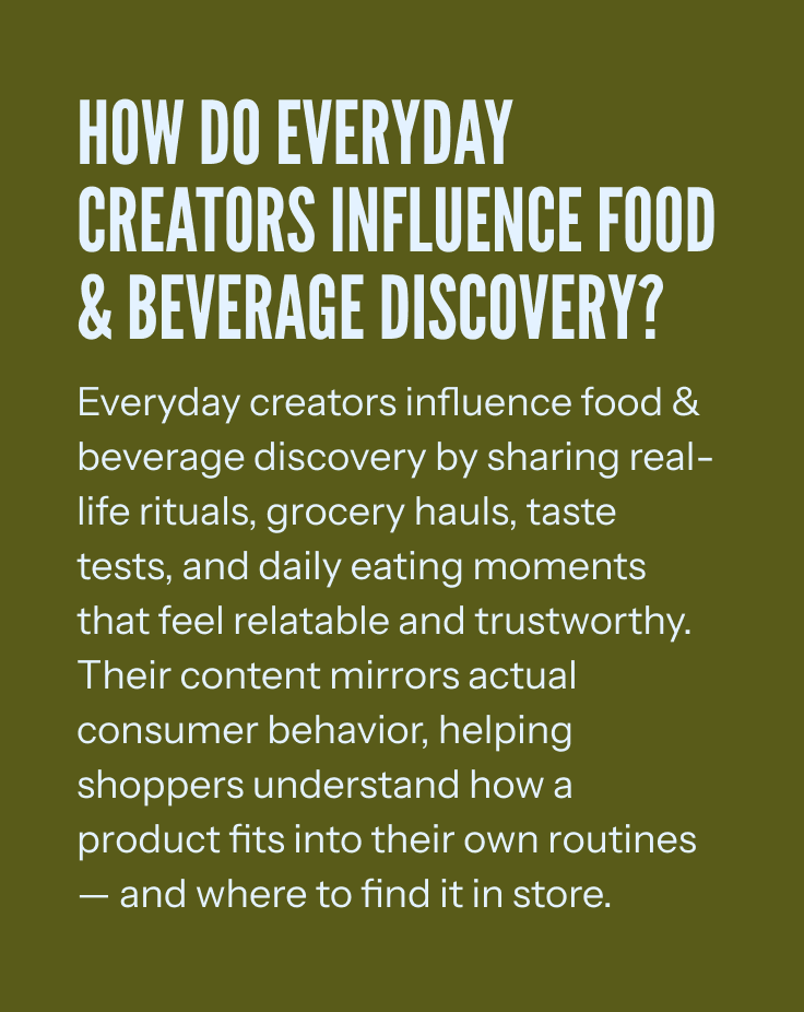 According to our report, real-life storytelling is now the dominant driver of awareness across the category. Snack breaks. Grocery hauls. Weeknight dinners. “Taste test” moments filmed in real kitchens. Everyday creators aren’t just posting content — they’re shaping the way consumers experience food, drink, convenience, and wellness.