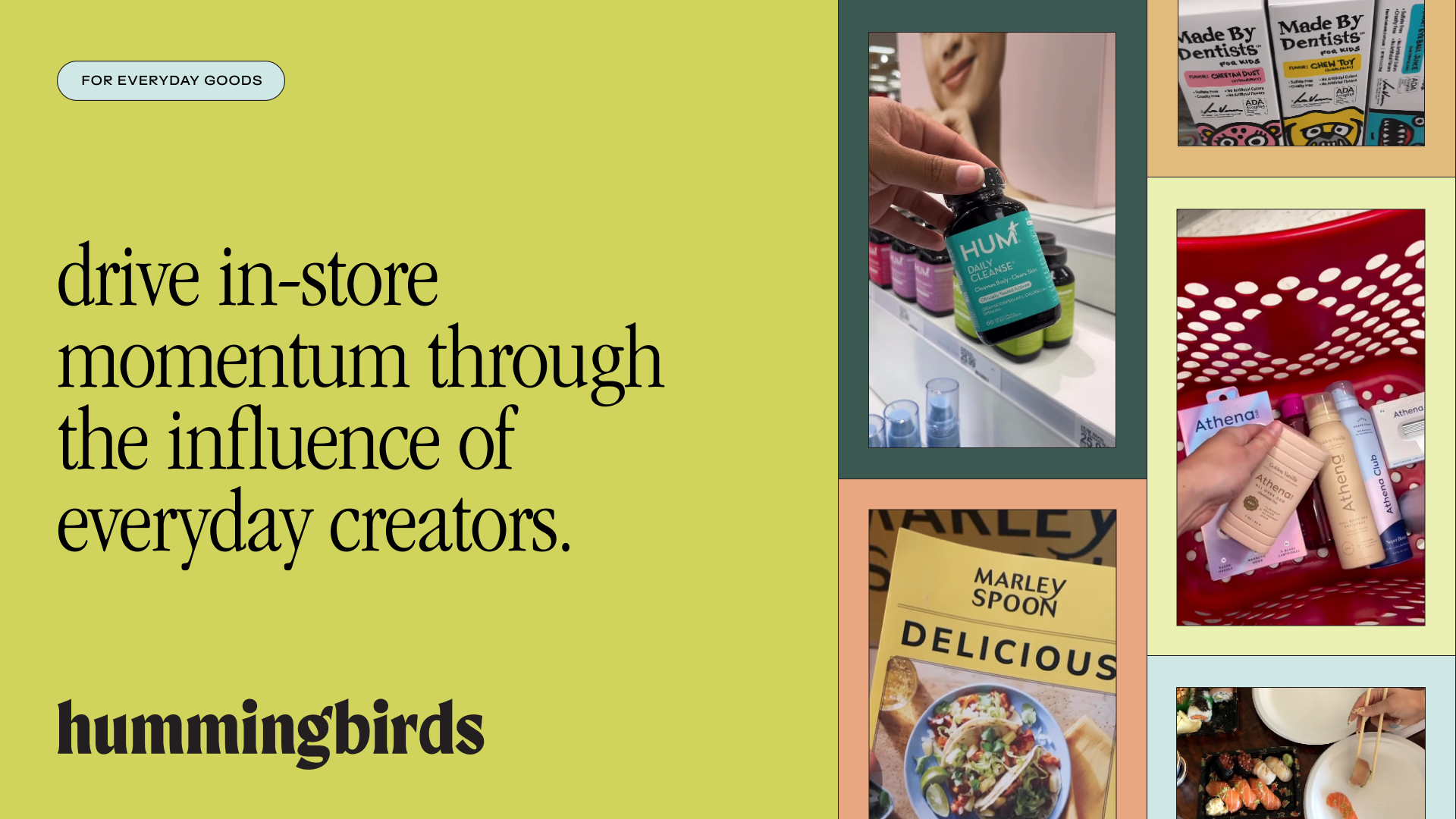See how our creators (we call them hummingbirds) turn retail shelves into scroll-stopping moments, with campaigns from Marley Spoon, Athena Club, Dropps, and more.